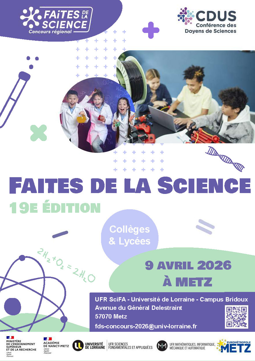Un concours national qui valorise la créativité scientifique des collégiens et des lycéens à travers des projets expérimentaux et technologiques. L’UFR Sciences Fondamentales et Appliquées (SciFA) et l'UFR Mathématiques, Informatique, Mécanique (MIM), composantes de formation et de recherche de l'Université de Lorraine, organisent la finale régionale à Metz.